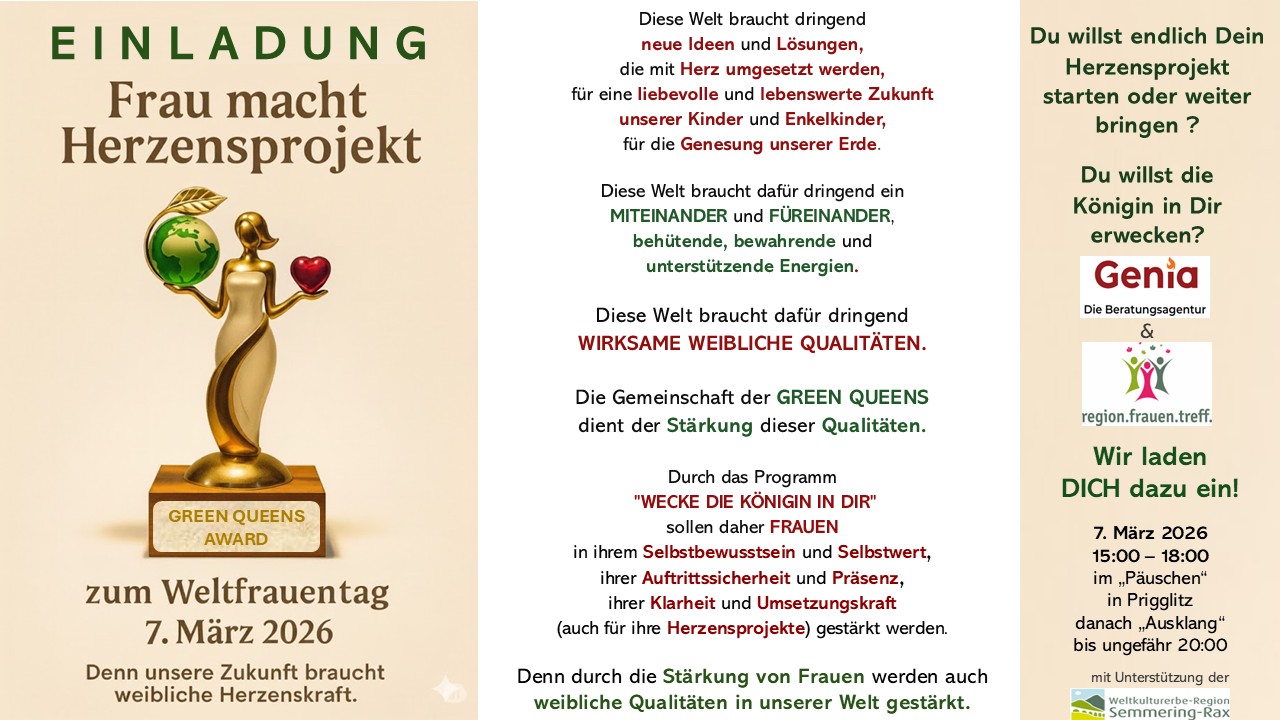 anlässlich Weltfrauentag laden wir ein zur Auftaktveranstaltung der „Green Queens“ am Samstag, 7.März 2026 von 15-18 Uhr in Prigglitz….