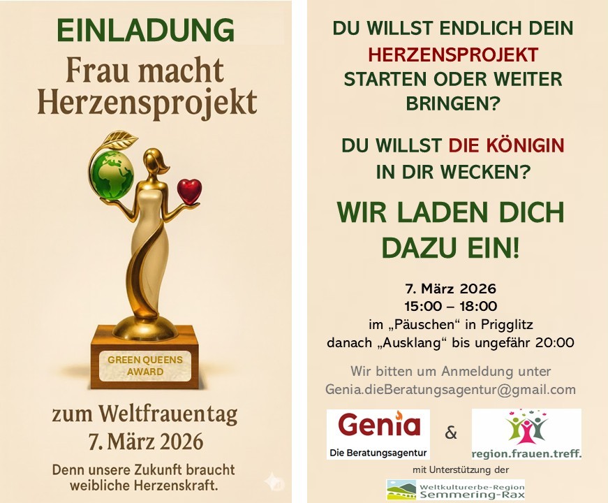 anlässlich Weltfrauentag laden wir ein zur Auftaktveranstaltung der „Green Queens“ am Samstag, 7.März 2026 von 15-18 Uhr in Prigglitz….